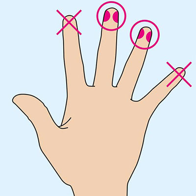 Hold your hand/arm downwards, massage your hand down to your finger, without squeezing, to encourage blood flow.